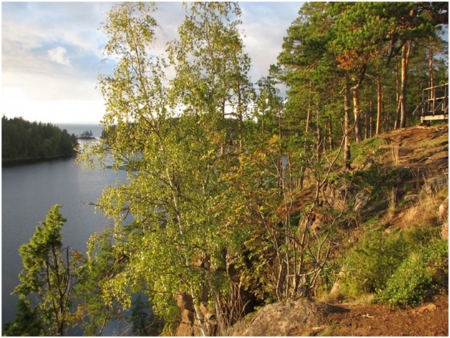 В 1980-х годах нам в разное время посчастливилось побывать на о. Валаам, на котором расположен этот монастырь. Для нас это место в то время являлось лишь местом паломничества, и мы никогда не думали, что спустя более тридцати лет мы вспомним его на этих страницах. А вспомнить – есть на то причина. Семь лет назад мы побывали на Еловом острове, который А.А. Баранов выбрал для строительства кораблей, а монах Герман (причислен к лику святых в 1970 г.) – для уединения в последние годы жизни. Для Германа Аляскинского Еловый остров, который мы посетили в самом начале марта 2005 года, служил дорогим напоминанием о его любимом Валааме. Остров Валаам – одно из самых живописных мест, которые нам когда-либо приходилось посещать. Мы увидели здесь почти дикую природу, заросшие чащи деревьев, подступающих прямо к озерной воде, высокие скалы, поражающие своей наготой, затерявшиеся где-то здесь таинственные кельи монахов-отшельников, в одной из которых и пребывал монах Герман перед тем, как отправиться в суровый край сивучей, нерп и алеутов. Еловый остров, о котором речь пойдет ниже, живо напомнил нам Валаам.