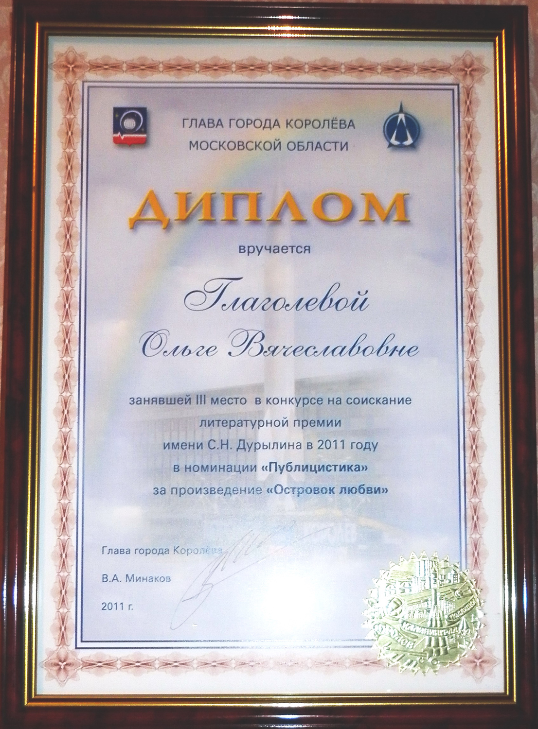 В наукограде Королёв Московской области 14 декабря были подведены итоги конкурса на соискание литературной премии имени Сергея Николаевича Дурылина, посвященного его 125-летию и 50-летию первого полета в космос. Одним из его дипл омантов в номинации "Публицистика" за книгу "Островок любви" стала наш автор Ольга Вячеславовна Глаголева. Поздравляем!