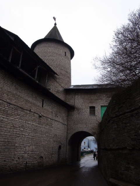 У Нижних решеток, на небольшой площадке хода крепостной стены, упирающейся в Плоскую башню, заканчивается наше путешествие по Псковскому Крому. Теперь наш путь лежит обратно на Торговую площадь.