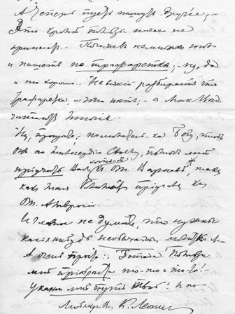 Вы напрасно беспокоитесь обо мне, дорогой Лев Ал-чь; можно сказать, что кончина от. Амвросия не произвела на меня почти никакого впечатления. Я, видя давно его крайнее изнеможение, еще лет 7-6 тому назад рассуждал с ним самим о том, как мне быть и к кому обратиться в случае его смерти… Не только мысль свою, но и чувство я давно приучил к этой скорой неизбежности (ему было, кажется, 79 лет, и лет уже 30 он все слабел и все медленно угасал, управляя всем с своего диванчика). Не беспокойтесь обо мне (с этой стороны); я привык в течение 20 лет обращения с хорошими монахами понуждать себя к подчинению духовнику, даже и тогда, когда он не вполне удовлетворяет меня*; а вот в Вас-то я вижу нечто такое (все с той же стороны, с религиозной), что меня за Вас тревожит. Боюсь – быть откровенным; и боюсь оскорбить как-нибудь; боюсь лишиться Вашего доброго расположения. Но, в надежде на то, что Господь расположит сердце Ваше принять слова мои так же искренно и просто, как я их говорю, буду откровенен. Вы на прекрасном пути; Вы ищете именно того, что нужно искать; но я замечаю в Вас какую-то нерешительность и вредную медленность. В чем же? Да хоть бы и в том, напр., что Вы, вероятно, и могли бы побывать в Оптиной и видеть от. Амвросия; – но откладывали и теперь жалеете.