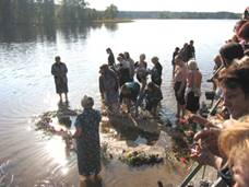 Это случилось в 2007-м году, 21 сентября, в день Рождества Пресвятой Богородицы. Неподалеку от нас, в Навашинском районе на Святом озере произошло чудо. Сторож одного из пансионатов, которые расположены вокруг озера, увидел, что у берега из воды поднялся небольшой песчаный островок, в центре которого выдавлен и заполнен водой силуэт женщины в полный рост с ребенком на руках. На воде покачивались семь алых лилий, которые никогда в наших краях алыми не бывают, а только белыми. В справочниках подобные цветы относят к разряду лотосов, которые произрастают только в тропиках. Силуэт явно напоминал Божию Матерь с Богомладенцем Христом.